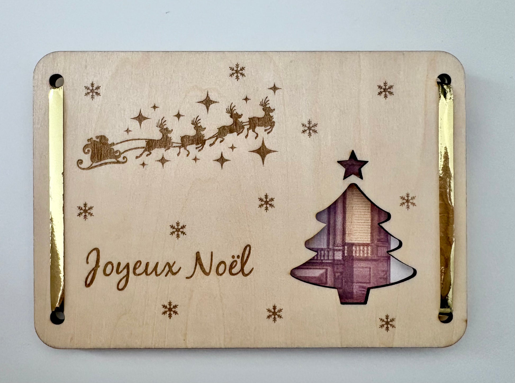 Enveloppe en bois spécialement conçue pour glisser un billet ou une carte cadeau à l’occasion de Noël.